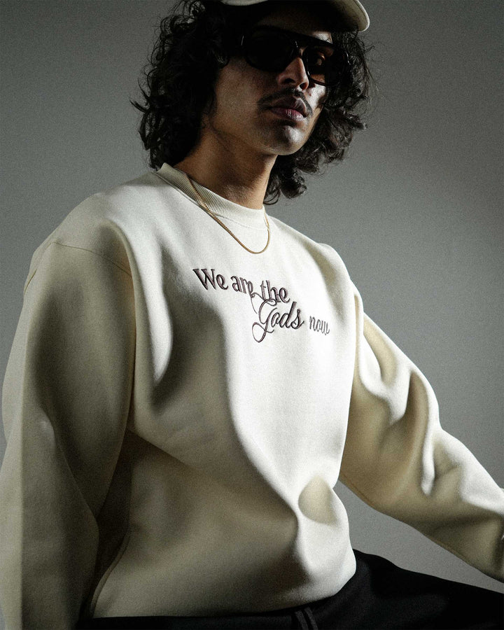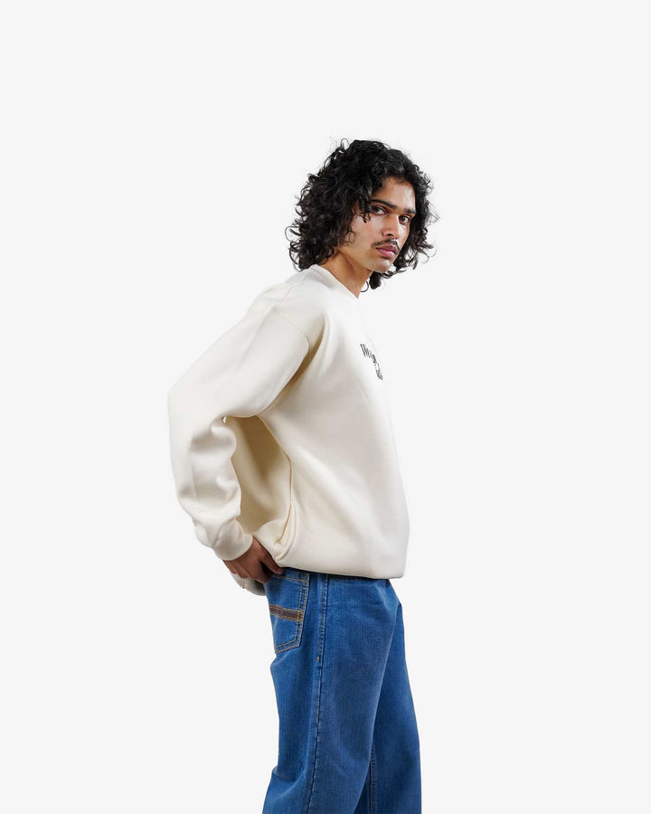 The Diabolical Sweatshirt is crafted from rich 400 GSM Cotton 3-Thread Fleece, giving it a heavyweight, structured feel with smooth softness enhanced by a double silicone finish. The cream base adds a clean, elevated look.