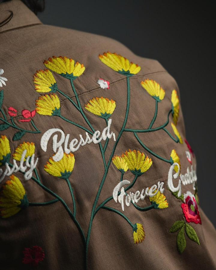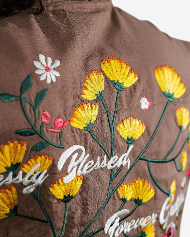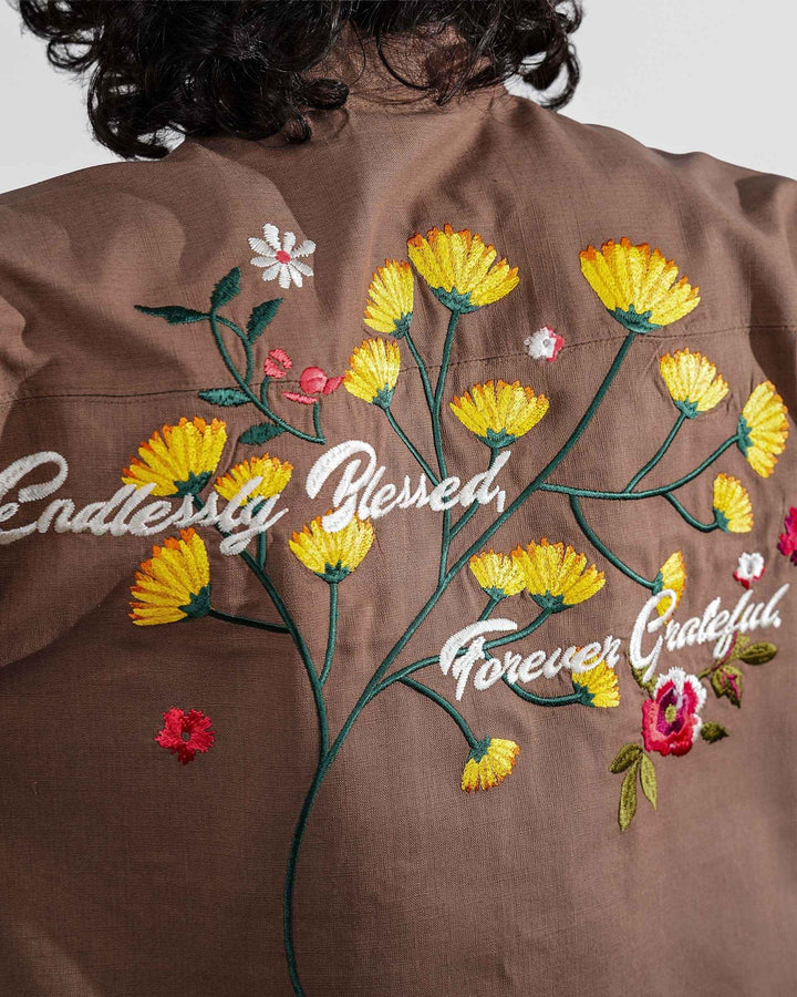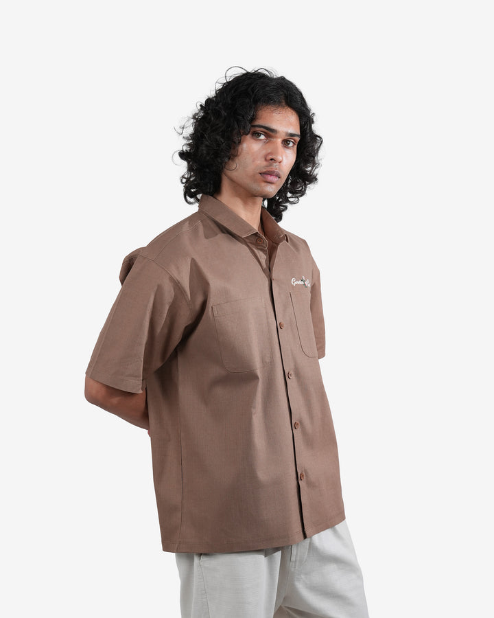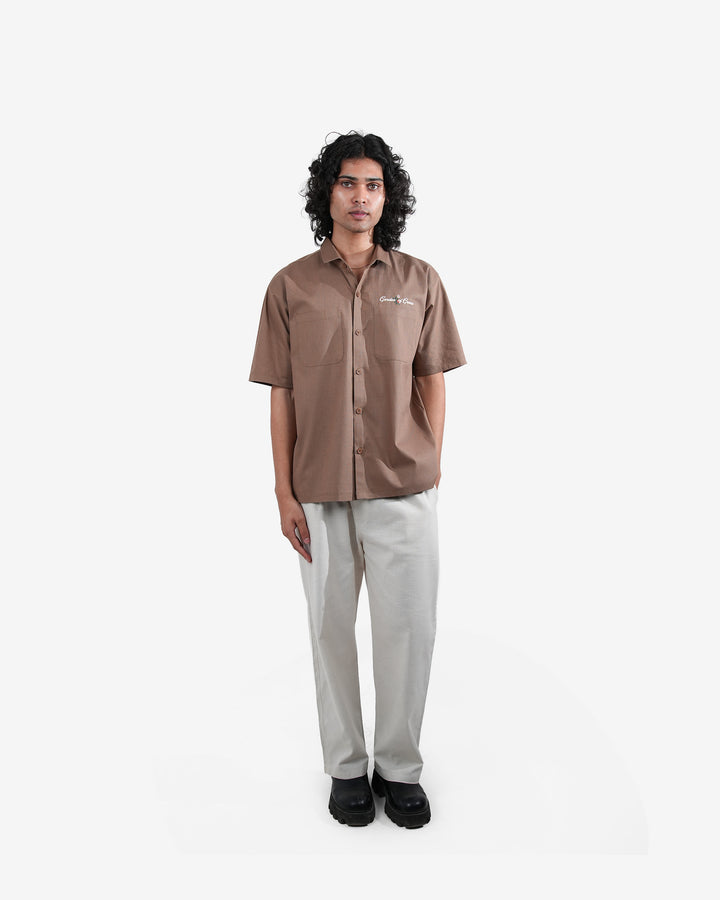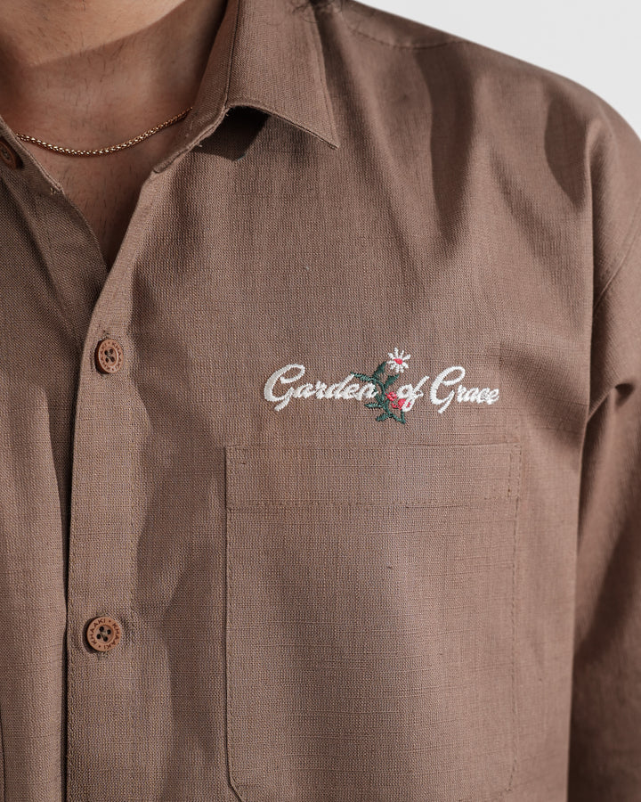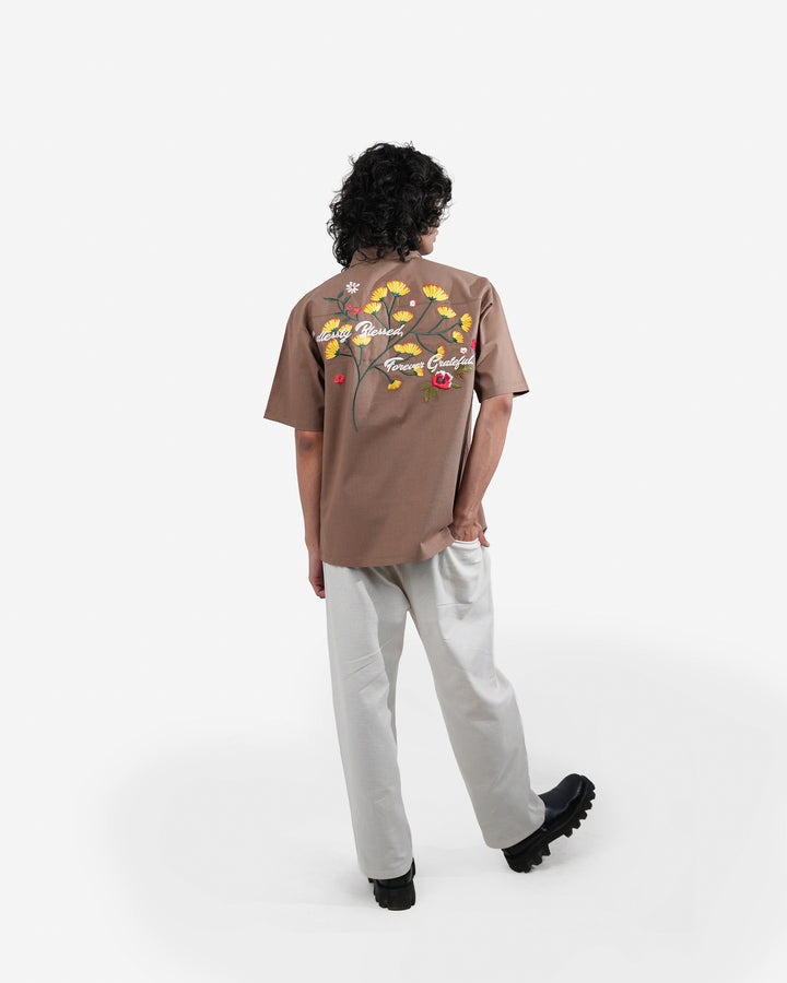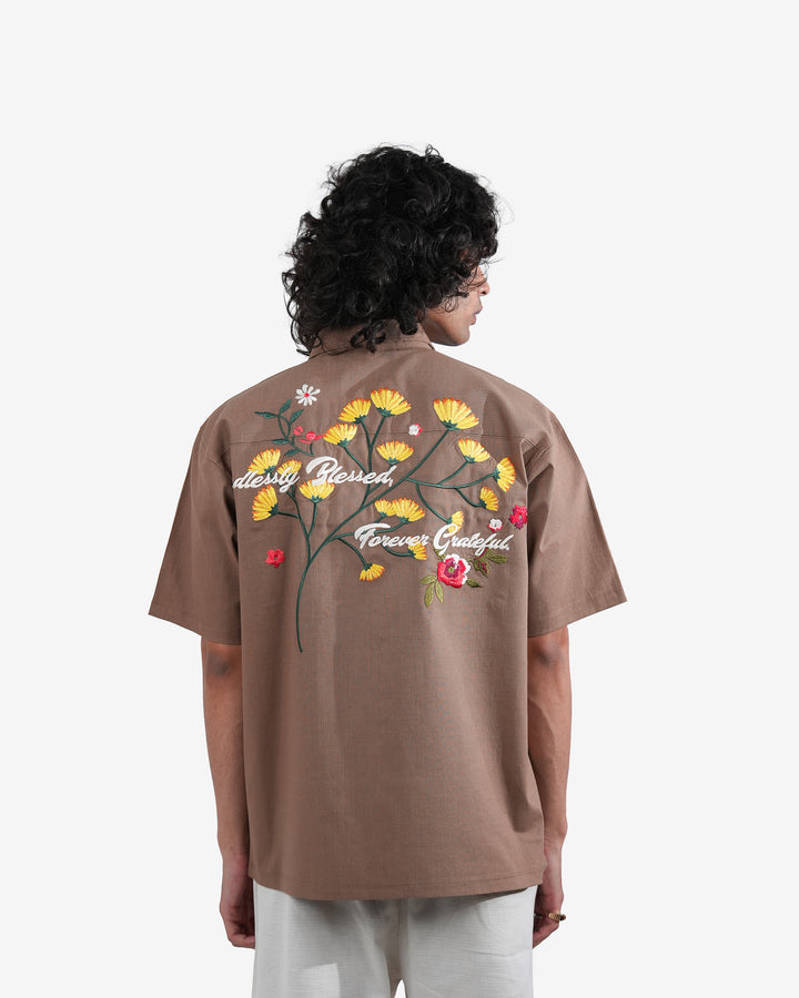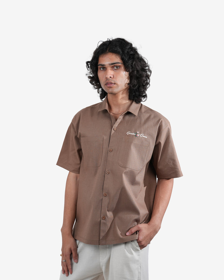 The Graced Garden Shirt is a relaxed khaki linen piece with a lapel collar, short sleeves, and chest patch pockets. It features detailed 3 lakh-stitch embroidery inspired by nature and blooms, giving a polished touch to everyday wear.
