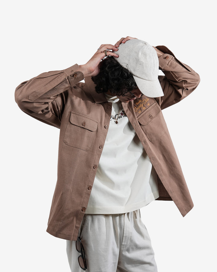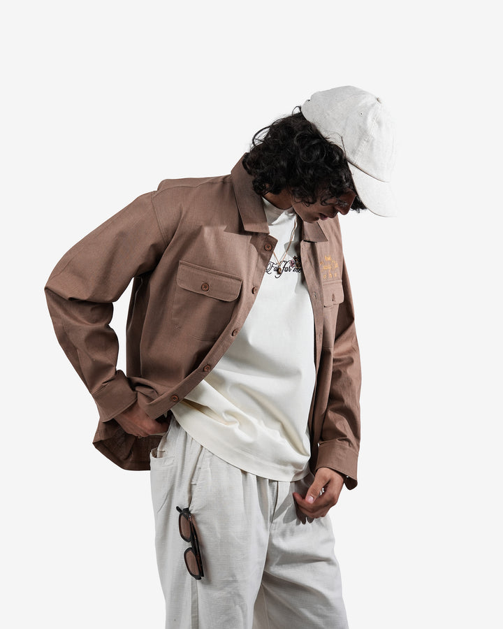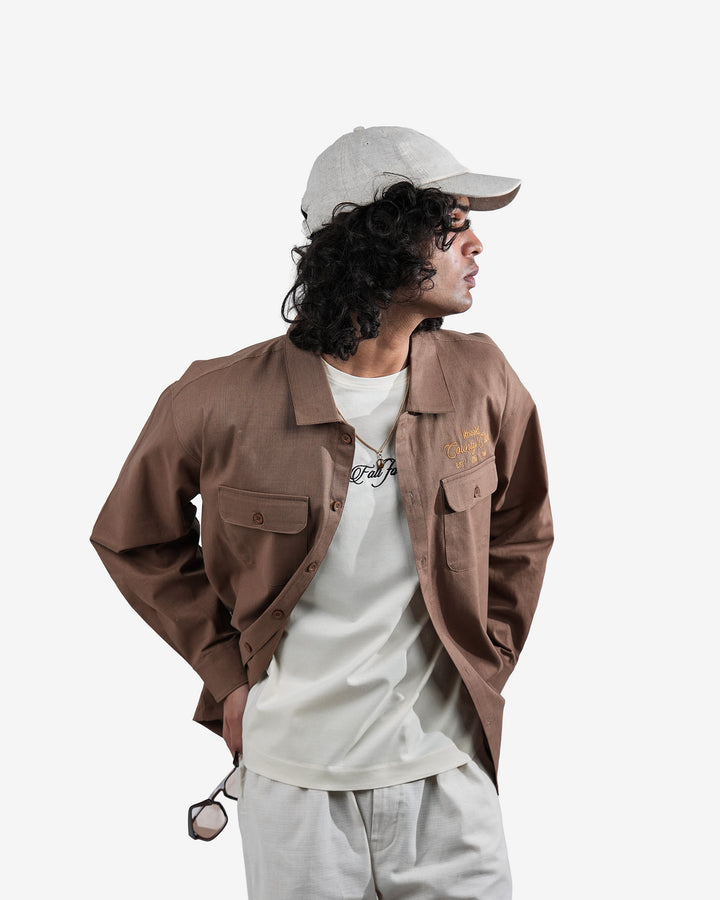 The Dreamer Shirt is a relaxed khaki linen piece that exudes fearless elegance and quiet sophistication. Structured chest pockets with the intricate 2.5 lakh-stitch embroidery in relaxed fit. It's a versatile piece & can be styled as a Shacket.