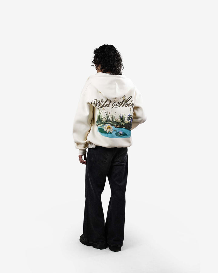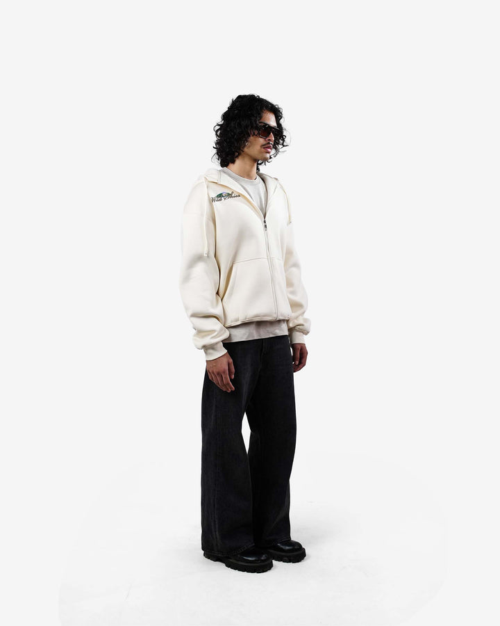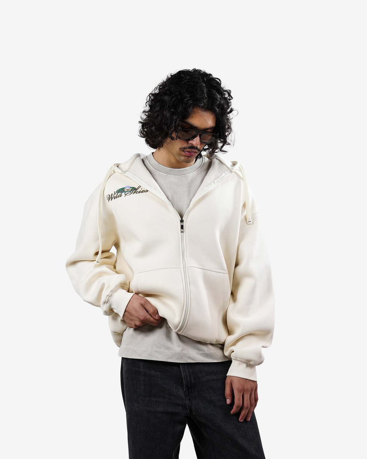 The Wild Skies Hoodie is crafted from premium 400 GSM Cotton 3-Thread Fleece with a smooth double silicone finish, giving it a rich, soft, and elevated feel. Its oversized zip-up silhouette brings a clean, modern streetwear look.